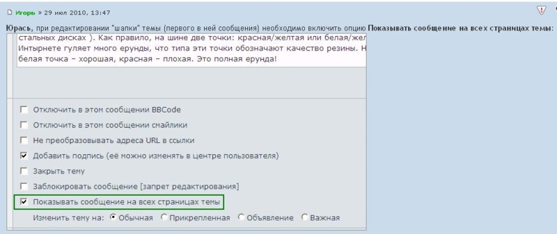 При редактировании "шапки" темы (первого в ней сообщения) не отображается опция Показывать сообщение на всех страницах темы