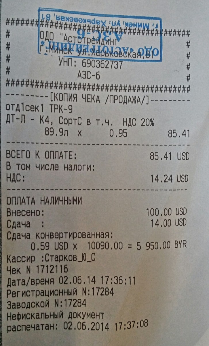 ILYHAN писал(а):А меж тем сегодня имел разговор с технарем Белоруснефти. Заметил, что при оплате картой говоря, например, на 100 000, снимается 100 000, но в фискальном чеке 99 950.