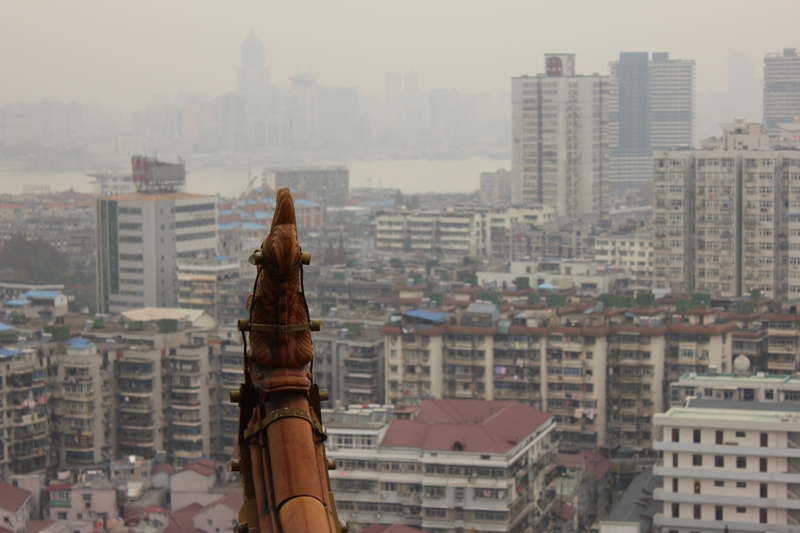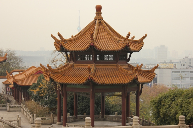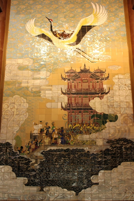 Немного из истории, что помню: для жителей Китая это является символом города Ухань. Расположена на Змеиной горе (после она будет видна на фото). Ее история насчитывает почти 1800 лет. Согласно легенде давно-давно в корчму некоего "чувачка" приходил поесть старик. Он был очень жалок и стар и хозяин не брал с него денег. Так продолжалось какое-то время (вроде около полугода). И старик, в благодарность за гостеприимство, апельсиновой коркой нарисовал на стене желтого журавля. Как только хлопал хозяин в ладоши журавль оживал и начинал танцевать. Птица привлекала внимание, и посетителей, дела пошли в гору. Так продолжалось около десяти лет, до тех пор, пока в корчму снова не пришел старик и не улетел на желтом журавле. А хозяин корчмы, в благодарность о чуде построил Башню желтого журавля. Вот такая вот легенда. В свое время она была разрушена и в 1985 году (год моего рождения) ее восстановили (почти сто лет ее не было). Также она является одной из первых башен всего Китая. Высота более 50 метров.