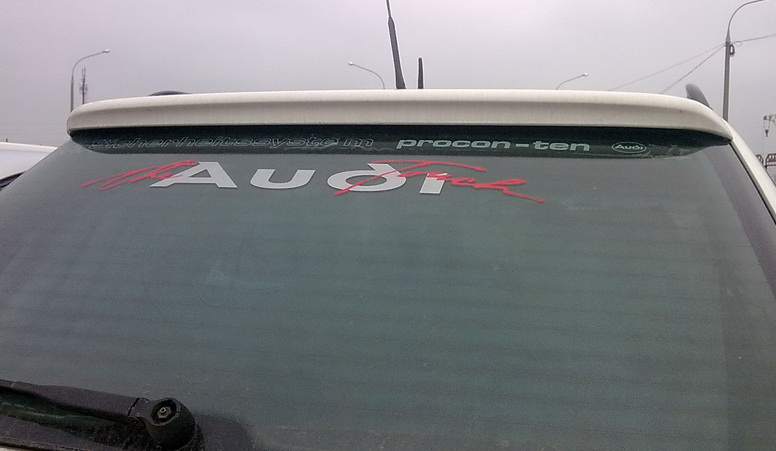 Вот такая цаца на аванте. Есть зазор между стеклом и спойлером, т.е. теоретически, часть потока обдувает стекло и оно не так пылится. Это 100С4 на парковке в Ждановичах со стороны Кунцевщины.