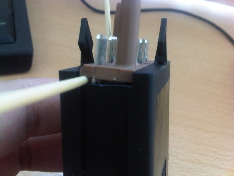 шесть плоских контактов припаяны к плате, плата физически сзади не достать, он вынимается спереди. вобщем без вандализма разобрать никак нельзя. как вариант, пробовать нагревать контакты паяльником что-бы они нагрелись и смогли пройти сквозь коричневый пластик
