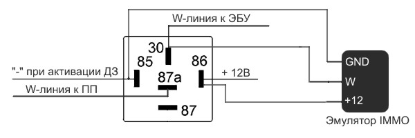 85 контакт реле: соединяем с "-" эмулятора ИММО, а также с проводом сигнализации, на котором появляется "-" при активации режима ДЗ