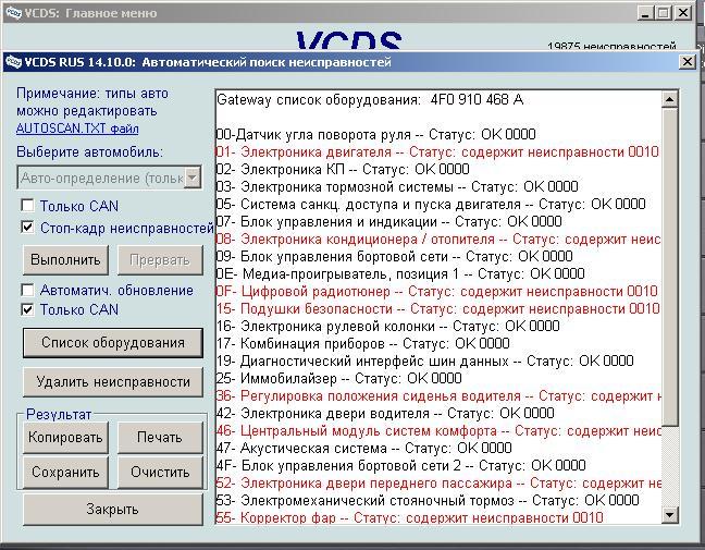 Подъехал, сбросил ошибки с блока "05" и машинка ожила. В списке оборудования картина плачевная - все блоки были "красными". После сброса половина ошибок ушла, но все равно есть над чем работать: