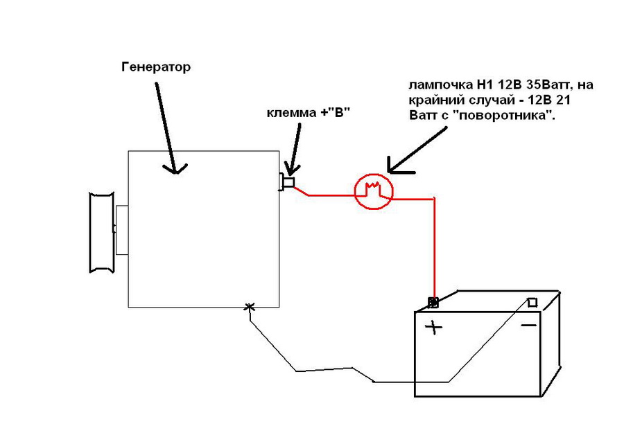 И при проверке диодов генератора лампочкой (как на рисунке выше) провод с генератора, который "уходит" на аккумулятор со стартером, необходимо разъединить.