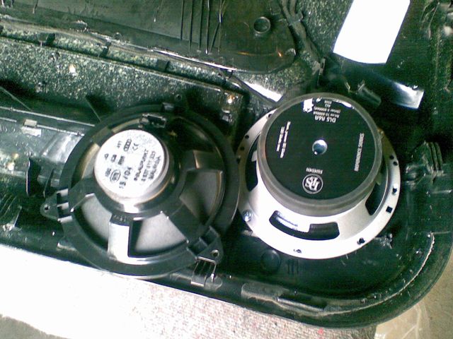 Снимаем обшивку и инсталлируем динамики. Для сравнения показан штатный. Надо сказать, что на мой вкус штатные звучат вполне достойно (стоял Блаупункт). В задних дверях оставил штатную (пока).