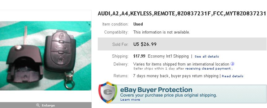 ): "Вы предлагаете цену на используемый неразрезанный хорошем рабочем состоянии AUDI вход без ключа пульт дистанционного управления для А4, А6, А8, S4, S6, TT 2001-2004 и некоторые другие модели. Вам нужно перепрограммировать перед использованием самостоятельно или, по крайней местному дилеру за небольшую плату вежливости или даже бесплатно, не уверен, что модельный год, но если FCC ID и матчи номер модели, то должно работать. Пожалуйста, свяжитесь с вашим местным дилером перед началом торгов, чтобы убедиться, что он совпадает с вашим автомобилем ключ. Счастливые торгов" Поидее он с платой внутри, надо только привязать к машине. Жало не нарезанное даже вроде. Можно купить прямо сейчас за US $31.99 либо сделать ставку больше US $28.99 и когда аукцион закончится (через 5 дней 10 часов), можно купить дешевле.
