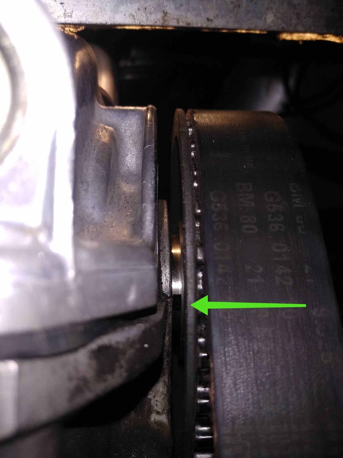 Зелёная стрелка-метки на шкиве и "самодельная" совпадают(ставили до меня) Метки(оранжевая стрелка) на самом насосе и кронштейне(чёрном) чуть чуть не совпадают, но обратите внимание, что насос загнали в одну сторону (я так понимаю до упора) что видно большое пустое пространство под болт, для регулировки.