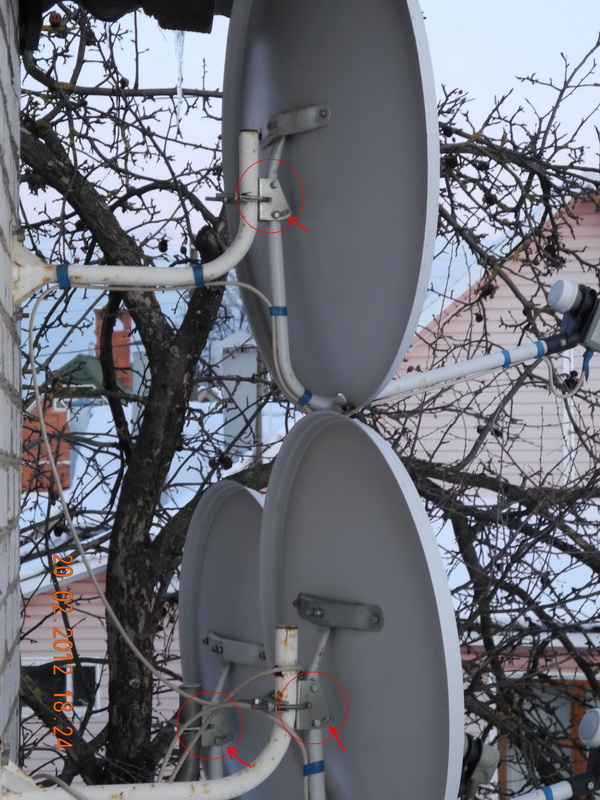 чтобы проще было настроить сигнал, посмотри в какую сторону повернуты соседские нтвэшные тарелки и приблизительный угол их наклона... сильно вверх задирать ненадо. скобу, которая держит тарелку за кронштейн, нужно перевернуть, чтобы регулировочный паз оказался внизу... сейчас сделаю пару фоток, чтобы представлял о чем я говорю
