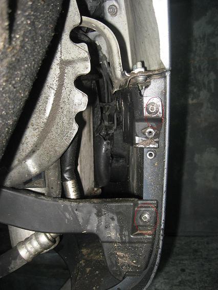 6 Выкручиваем все болты сверху на бампере и и под ним (которые так или иначе удерживают бампер, вот тут надо не ошибиться и не выкрутить лишнего!!!!! Красный кружок выкручиваем, белый крестик нетрогаем =)))))