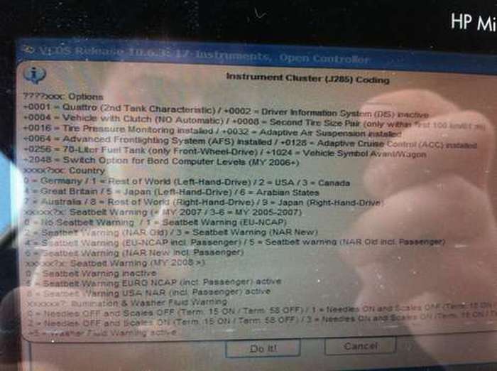 4) Видим панель подсказок. Обращаем внимание на то, что из 7 цифр кодировки, для АКТИВАЦИИ омывайки (washer liquid) надо добавить +5 к коду, меняется последняя цифра только. (последняя сторка , плохо видно)