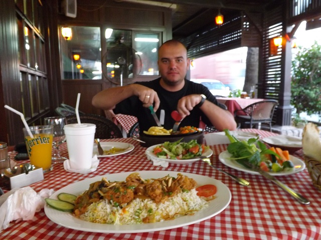 Вечер был посвящен празднику живота и распитию спиртных напитков. Кстати - спиртное в Эмиратах под запретом. Равно как и распитие так и продажа. Поначалу этот факт нас особо не беспокоил, ибо запасы позволяли несколько дней отдохнуть в пьяном угаре, НО оооочень хотель пива. Ужин в близлежащем ресторане обошелся в 28 долл на двоих. Порции таковы, что осилить не смогли и за три часа непринужденной беседы под виски (на фото в белом стаканчике