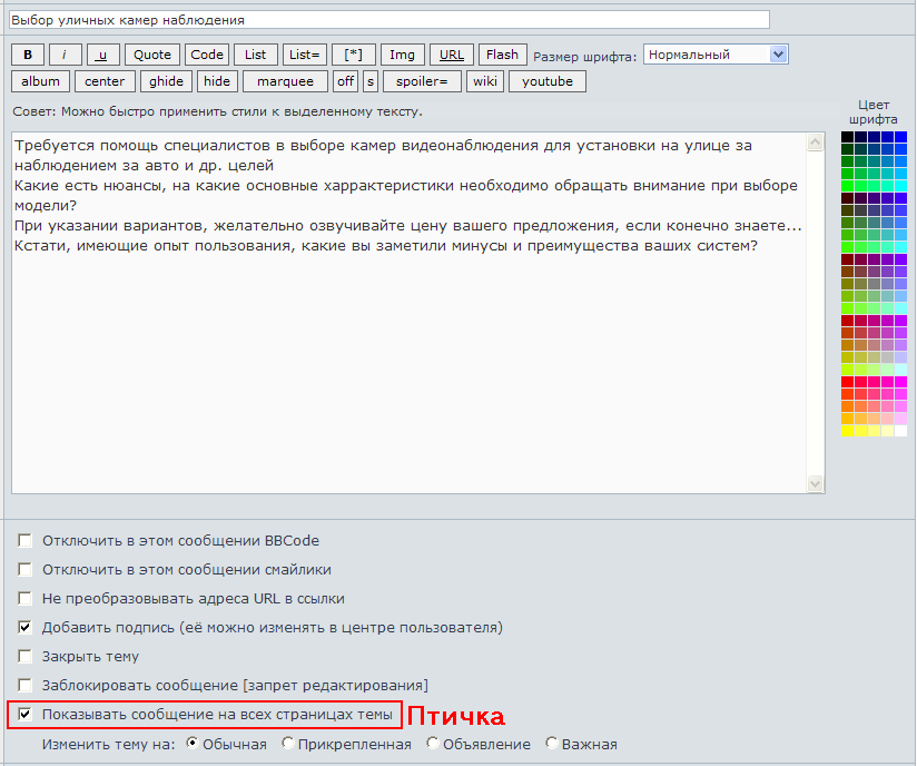 при создании темы, не нашел, где нужно поставить галочку, чтобы первое сообщение было на всех страницах... хотелось бы, обновлять первое сообщение, при появлении новых вопросов