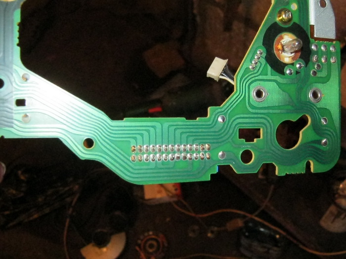 Ну а теперь о главном: подавляющее большинство проблем со щитком рассматриваемых автомобилей, связаны с "распайкой" контактов разъема щитка (см.стрелки). В большинстве случаев, траблы с негорящими индикаторами, прыгающими стрелками лечится простой перепайкой контактов, то есть, э-э-э, достаточно просто по-новому пробежаться паяльником по пайкам.