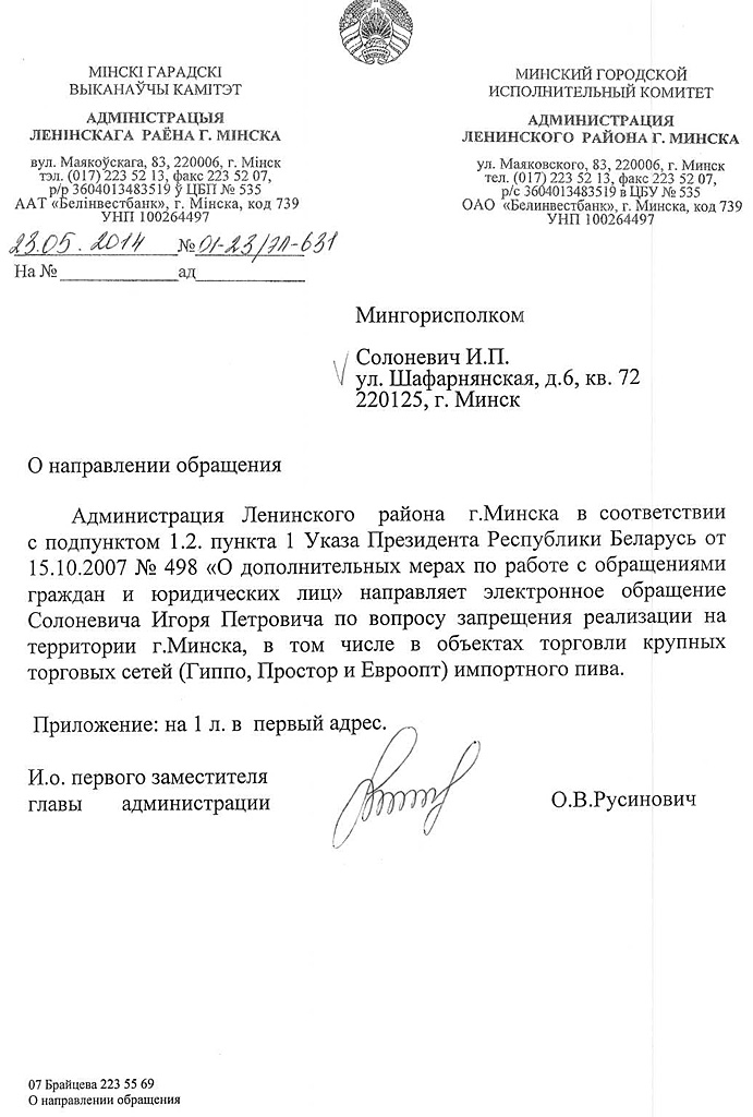 Ответ Администрации Ленинского р-на г. Минска по поводу запрета на реализацию импортного пива.