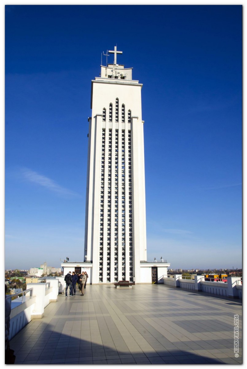 Построен он был в 40-х годах прошлого века, но выглядит так. как будто поработал современный архитектор. Если бы не крест на его башне, мы бы вряд ли догадались о предназначении этого сооружения: отсутствие наружных украшений, интерьеры в стиле хай-тек, зеркальный мраморный пол, лифт ведущий на открытую смотровую площадку.