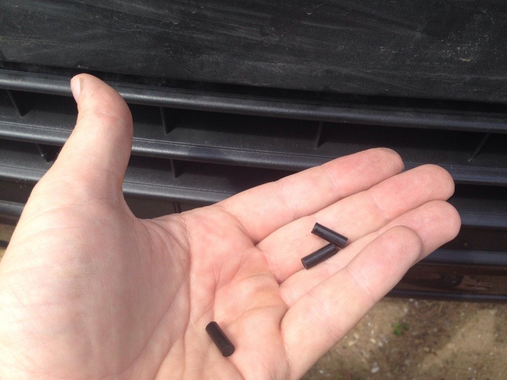 6. В середине этих фиксаторов видим вставленные пластиковые штифты. Их надо протолкнуть внутрь. Чтобы не потерять штифты, лезем рукой к внутренней поверхности бампера (при снятой верхней решетке проблем не должно быть) и ловим эти штифты.