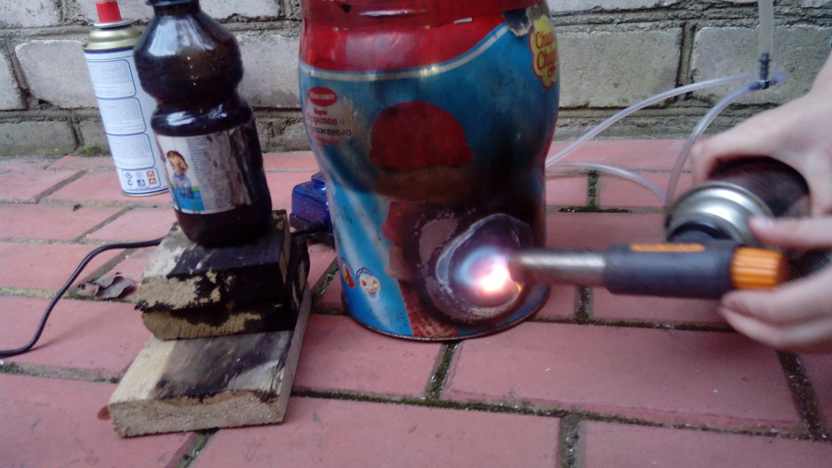 Заполняем банку щепой, закрываем крышку, включаем компрессор на максимум и поджигаем