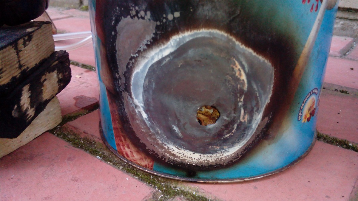Итак, берем банку и внизу просверливаем отверстие ф8мм. Через это отверстие будет производится поджиг щепы и подсос воздуха.