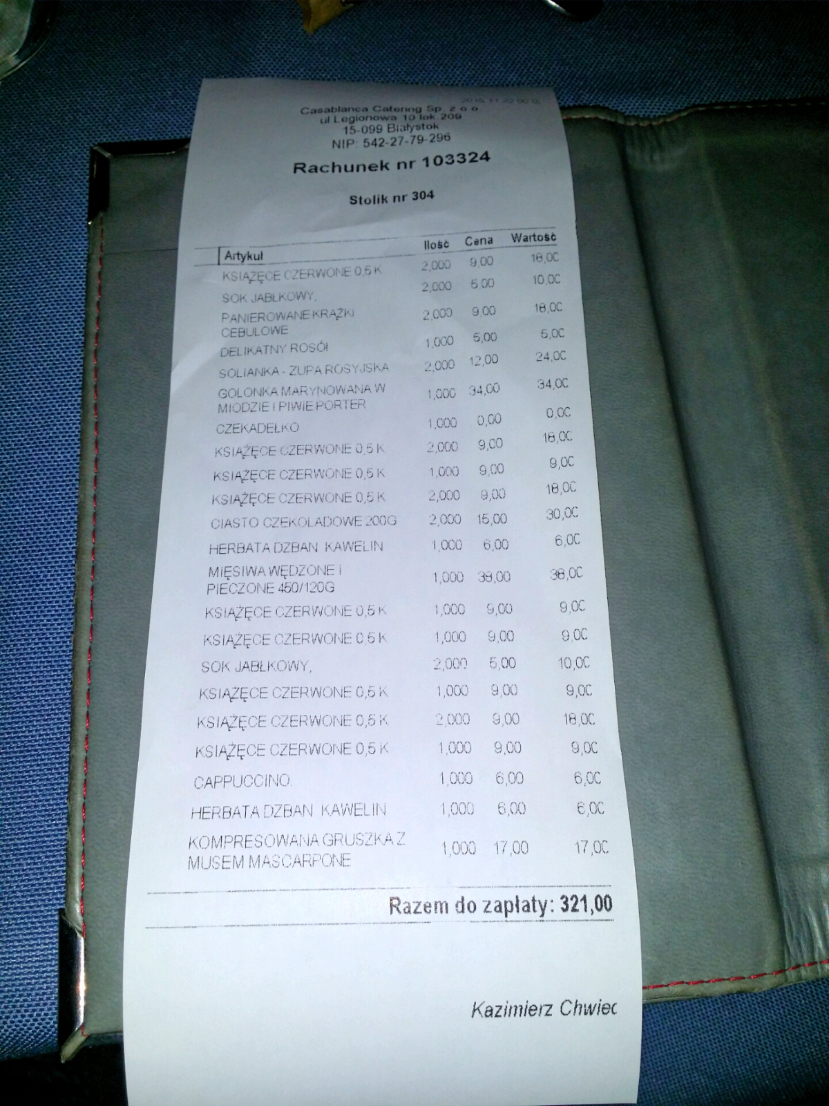Вот Вам и Белосток, вот Вам и Польша. Вчера с 17 до 2 сидел в ресторане. Ел,пил все что хотел, пока влазило. И как Вы думаете счет какой принесли?