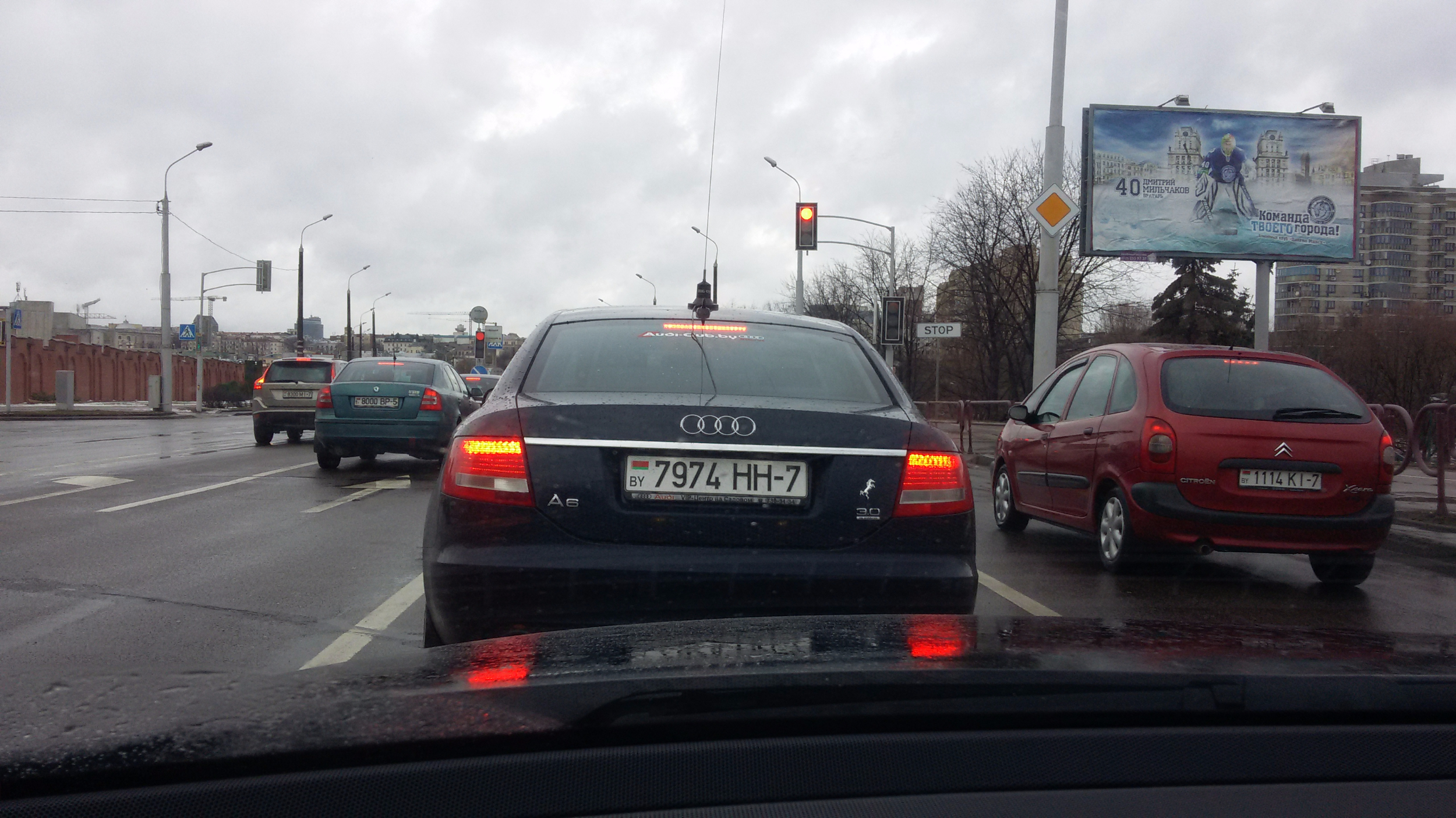 Внутренний мкад около ПВТ, около 9:00, серая A6 C6 Avant с клубной рамкой и клубным (от бел-кома) шильдиком. С суровым на лицо дядькой в качестве водителя