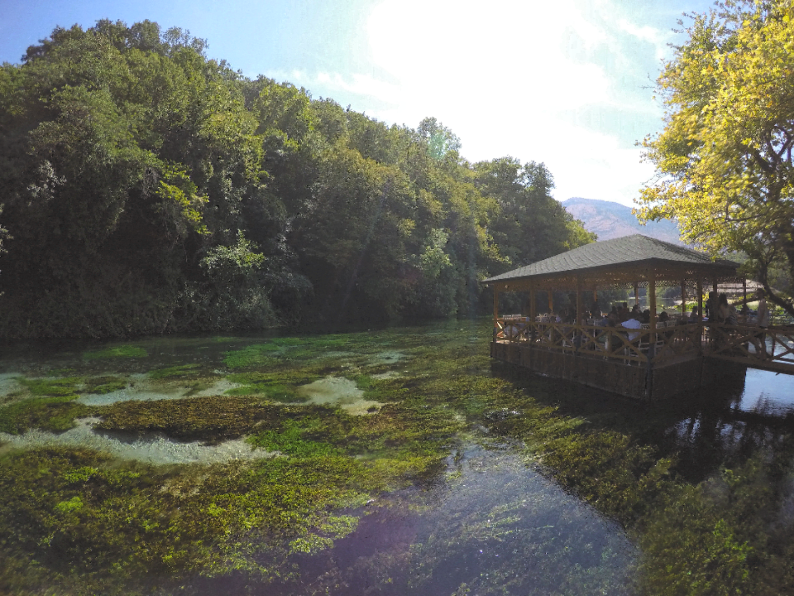 Преодолев подьем и спуск мы добрались до достопримечательности Blue eye. Вход/вьезд платный - 50 ALL с человека. Представляет из себя подводный источник с изумрудным цветом воды. Далее он образует реку, на которой располагается гидроэлектро станция и река впадает в Ионическое море в районе Саранды. Вода там холодная, не не так - ледянющая. Я смог находится не более десяти секунд и начинало сводить конечности. На на жаре очень приятно было сделать около 5 заходов и освежиться. На реке рядом расположено кафе. Цены в раза 3 выше обычных, но все равно дешевле чем в остальной Европе.
