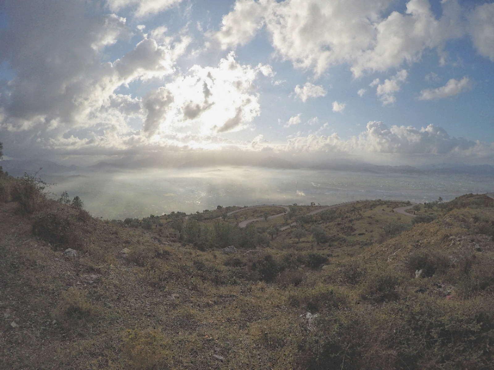 Дорога позади нас выглядит как змейка, убегающая вниз в пропасть, где остался интересный город Эльбасан: