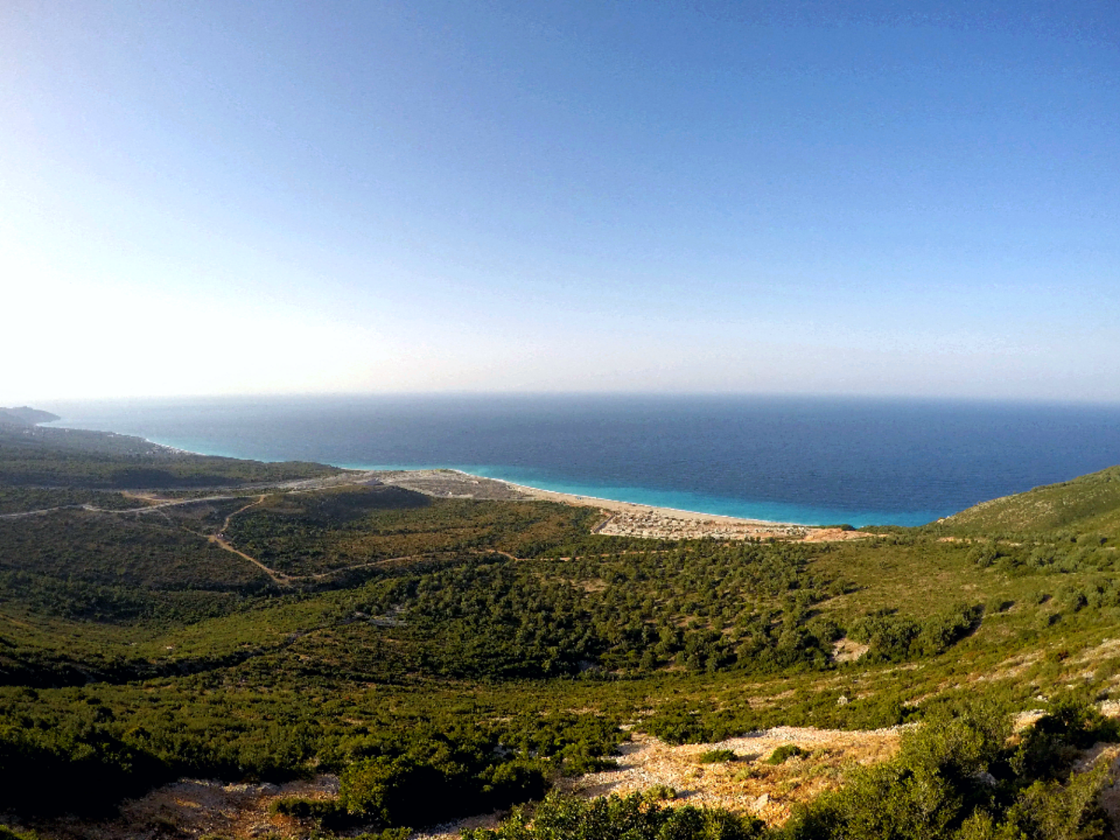 Влера, наша конечная точка на сегодня находится на уровне моря. Т.о. нам пришлось сбросить всю набранную высоту. Северный склон перевала встретил нас сильным ветром, который даже чуть не сдул Машку с дороги. Скорость велосипеда очень редко была ниже 40 км/с. На этом спуске я установил свой личный рекорд по скорости на велосипеде. Не знаю как вам назвать эту цифру, чтобы она ассоциировалась с великом