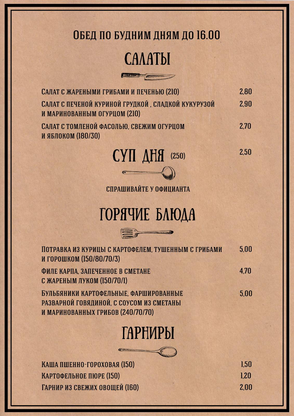 Работает в тестовом режиме. Официальное открытие 11 мая. Обеденного меню нет. Вот основное: