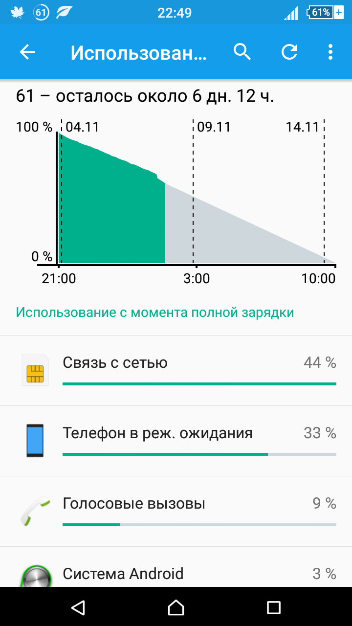 Вот утром сейчас просит зарядить, осталось 14%, а это еще на половину рабочего дня - 20 минут разговоров и интернета немного.