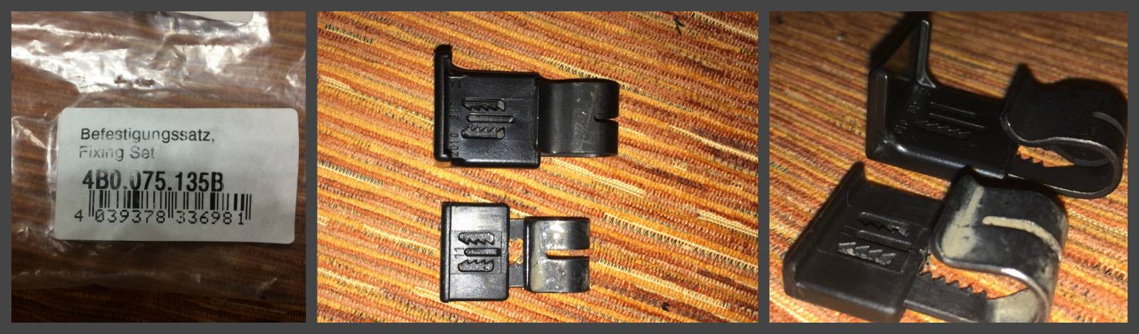 Крепежи от БМВ похожие на крепеж от VAG - 4B0 075 135 B, толще и в месте захвата имеются выступы немного мешающие прилеганию. Пробовал спиливать но все равно плохо становится