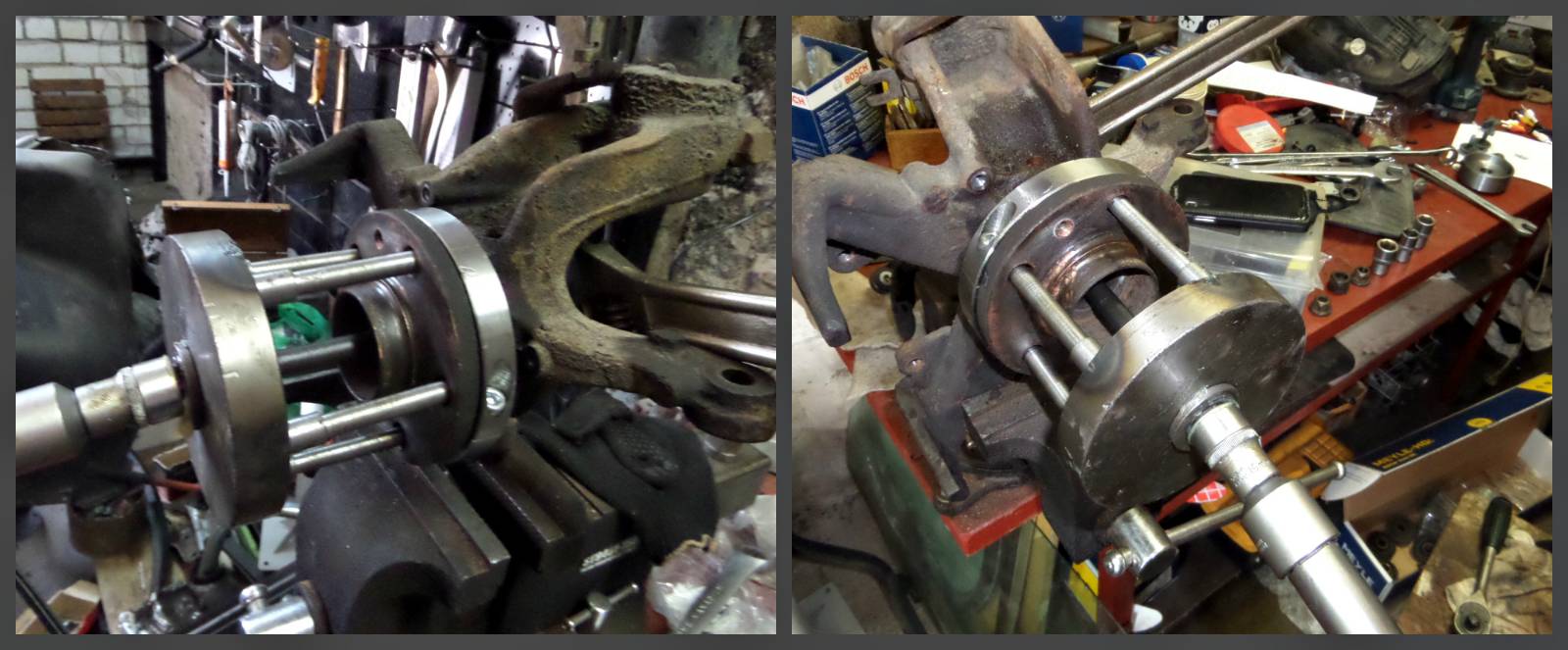 — если запрессовывать подшипник в тисках или любым другим "стандартным" инструментом, то давление оказывается на саму ступицу, после чего усилие передается на подшипник, который мы и запрессовываем. Это неправильно и в момент опрессовки может привести к дефекту подшипника, либо сократит срок его службы. По регламенту опрессовка должна происходить с обратной стороны ступицы, приложение усилия идет на сам корпус подшипника