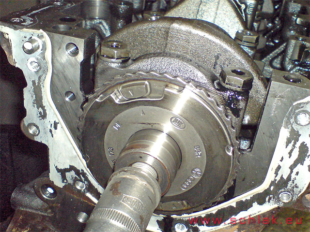 Вид на коленвал, старая - "лысая" шестерня пока ещё не снята...