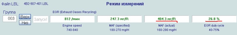 Во первых надо учесть что рециркуляция при работе мотора на холостых работает 10 минут потом отключается, еще не плохо посмотреть его работу, вы счас по скрину в 08 группе-измерения, там внизу окна на вагкоме есть кнопка базовые-04, нажмите её и посмотрите 3 поле, прога начнет через 10 секунд включать и выключать рециркуляцию, интересно какие там будут значения, и будут ли они менятся в 3 поле? такое впечатление что она у вас ваще не работает.