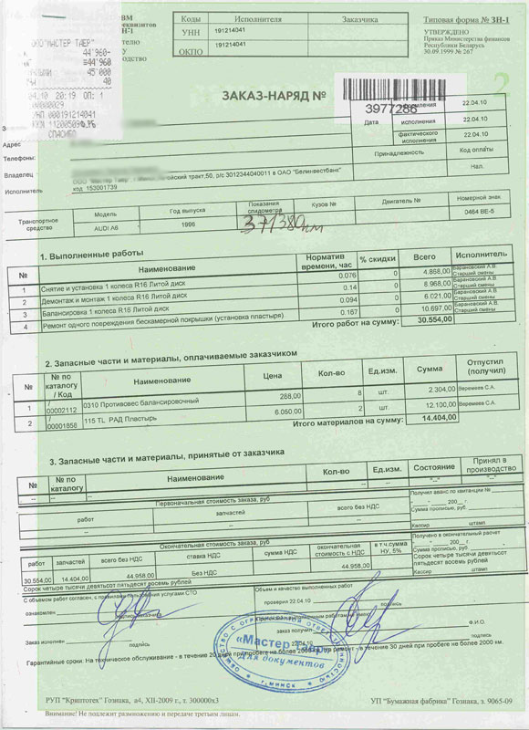 После 1,5ч проведённых на шиномонтаже (2 разбора/сбора, 2 заплатки и балансировка) я уехал с потраченными 44'960 рублями и весёлым вердиктом: передняя левая шина - труп, подлежит срочной замене...