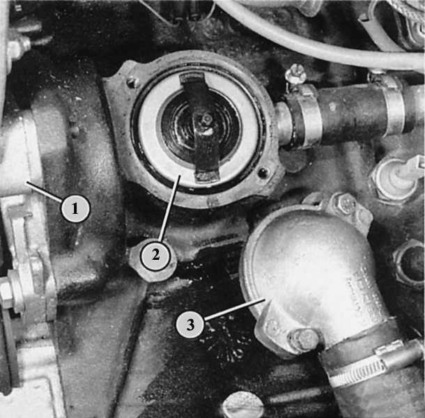 После снятия крышки корпуса (3) на левой стороне двигателя у 5-цилиндрового двигателя появляется доступ к термостату (2). Позиция (1) показывает водяной насос.