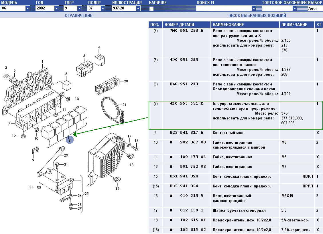 Блок управления стеклоочистителем/омывателем, длительностью пауз в прерывистом режиме - 4B0 955 531E и расположен над коленями водителя. Место реле - 5+6, т.е. занимает 2 места.Dimon2k5 писал(а):... скажите пожалуйста номер реле, отвечающего на стеклоочистители и где оно расположено