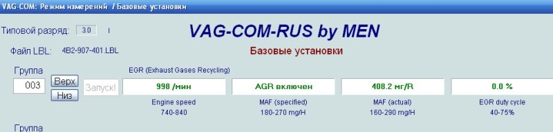 Во первых надо учесть что рециркуляция при работе мотора на холостых работает 10 минут потом отключается, еще не плохо посмотреть его работу, вы счас по скрину в 08 группе-измерения, там внизу окна на вагкоме есть кнопка базовые-04, нажмите её и посмотрите 3 поле, прога начнет через 10 секунд включать и выключать рециркуляцию, интересно какие там будут значения, и будут ли они менятся в 3 поле? такое впечатление что она у вас ваще не работает.