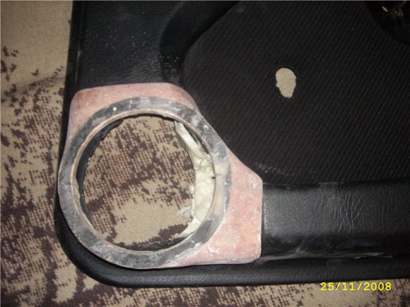 Приступаем к процессу: для начала нужно сориентировать место нахождения динамика, для этого я взял кольцо и примерил его на обшивке с закрытой дверью, опустил его максимально ниже, но так, чтоб он не упиралось ни в порог, ни в боковую стойку, сделал пометки на обшивке шариковой ручкой. Снял обшивку, понёс домой, снял заводской акустический корпус с ФИ, с задней части обшивки.