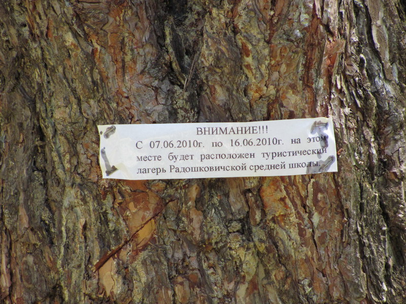 На деревьях по кругу расклеены объявления следующего содержания: "С 7.06 по 16.06 здесь будет располагаться туристический лагерь Радошковичской средней школы".