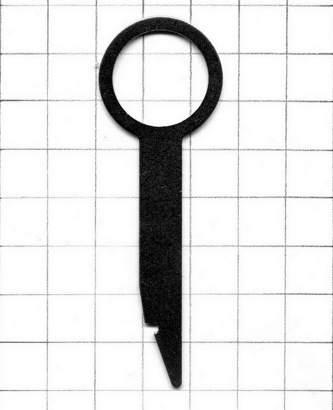 Вырезал по шаблону два ключа из пластиковых карточек(от мобильных сим-карт как вариант), вставил, оба защелкнулись с первого раза, магнитола досталась. 1 клетка - 1 сантиметр(подгонял в ворде