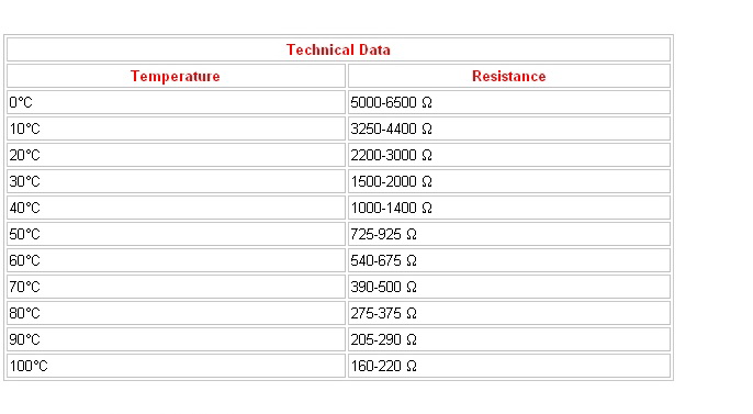 3. Таблица сопротивления датчика, при какой температуре окружающей среды датчик имеет какое сопротивление.