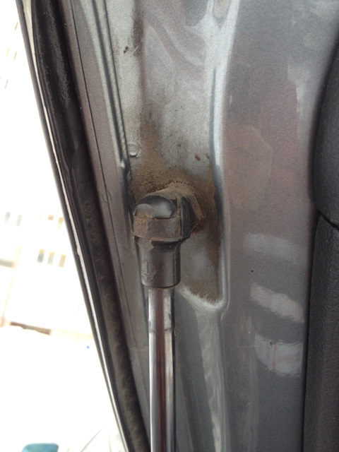 Далее чтобы проще было снимаем крепление с шара. И тут лучше привлечь помощника или палку, так как на 1 амортизаторе держаться крышка не будет. У меня таким помощником оказался сосед, который и помог и делом и советом.