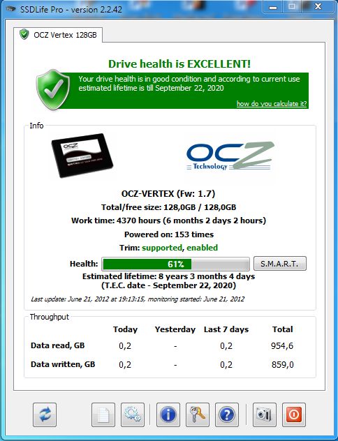 Наткнулся в нете на программулину довольно таки интересную: SSD Life Professional portable. Косвенно показывает сколько осталось жить SSD-ке :?