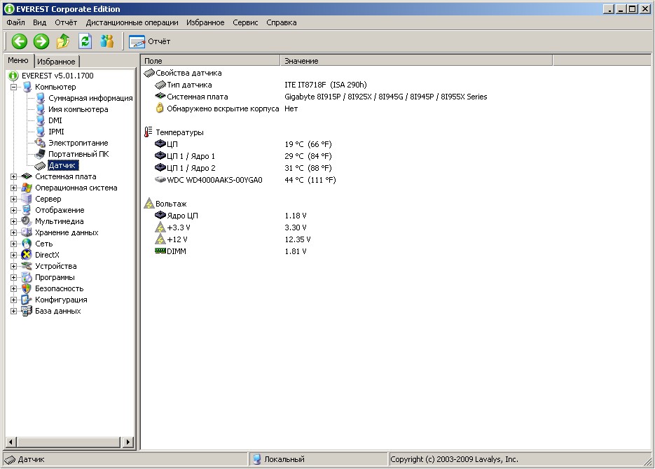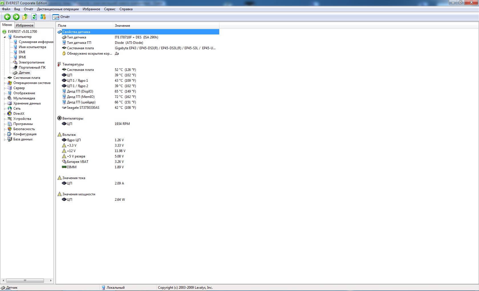 Состояние датчиков разогнанной системы