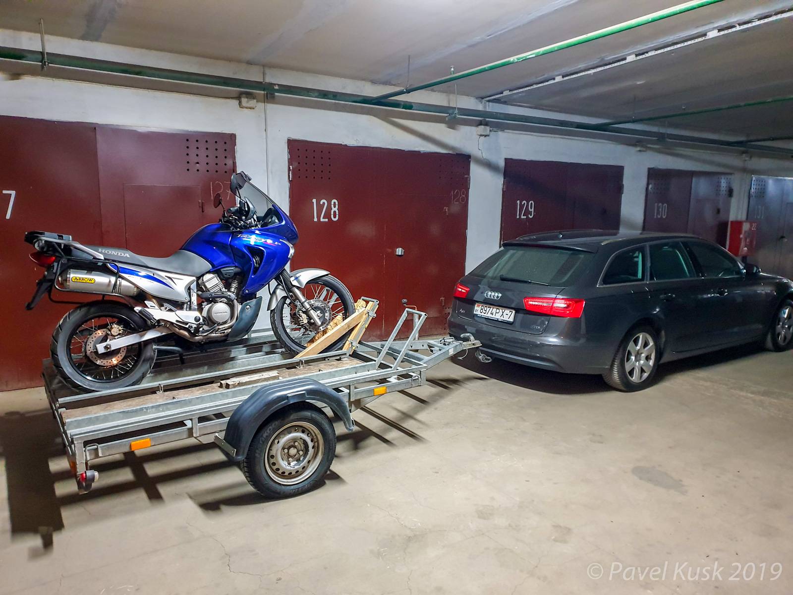Т.к. мотоцикл приехал в страну в прицепе, нет транзитов, да еще и нет категории под него, то опять понадобится прицеп. По Минску достаточно открытого, т.к. далеко ехать не нужно и мотик даже не запылиться. С прицепом безвозмездно помогли знакомые ребята мотогонщики и выкроили мне время между тренировками, за что им громадное спасибо. По моему звонку выдали мне открытый специализированный мотоприцеп на три единицы и два ремня для крепежа. Я все с вечера подготовил: загрузил в одиночку Альпаку на платформу, закрепил, и закатил все это дело на ночевку в гараж:
