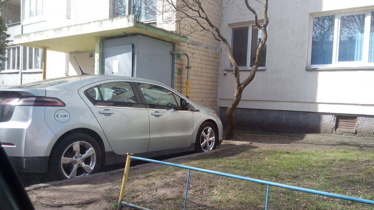 Под окном первого этажа выведена розетка. Сегодня эта тесла не "заправляется", либо уже зарядилась
