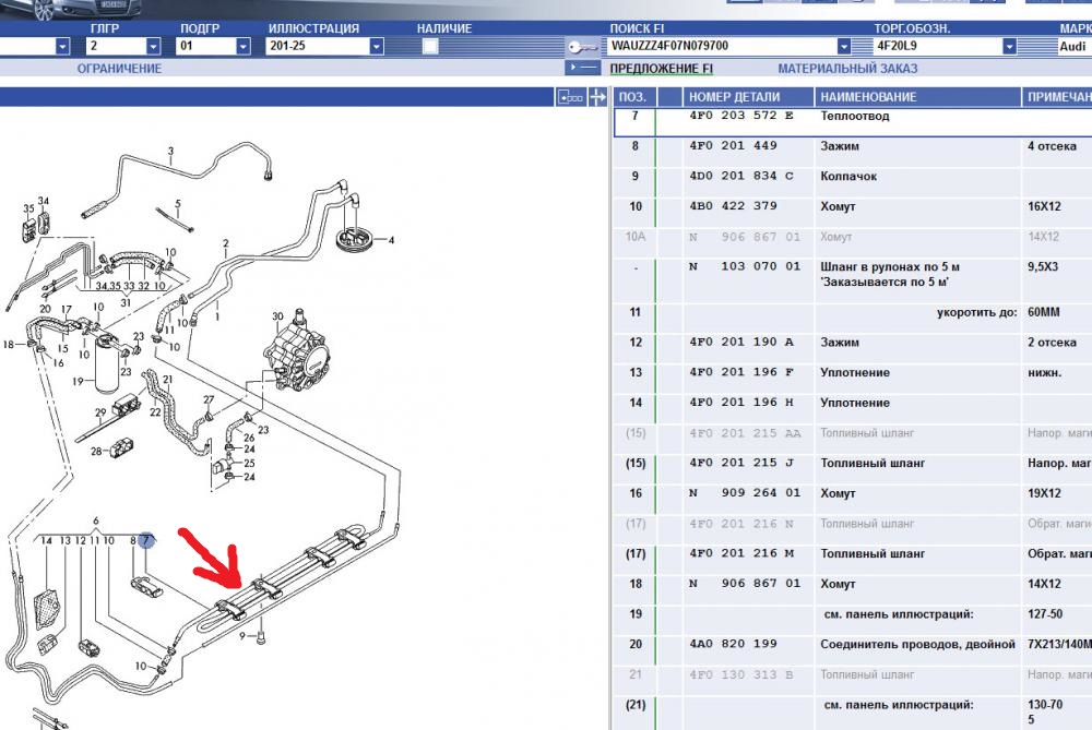 Потекла деталь под номером 4F0203572E (на рис. под номером 7) называется топливный радиатор или охладитель топлива, установлен на днище под защитным пластиком. Охлаждает солярку которая нагревается в процессе работы и сливается в бак, этот радиатор сделан в виде змеевика с ребрами из алюминия. Короче обычная трубка с внешним диаметром 10 мм., которая крепится хомутами к днищу и солярка подается в нее через обычные шланги маслостойкие...