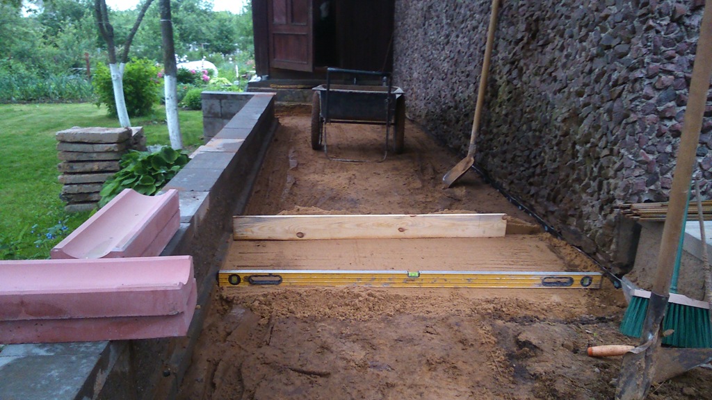 Затем насыпаем слой 2-3 см сеянного песка и выравниваем рейкой (провилом).