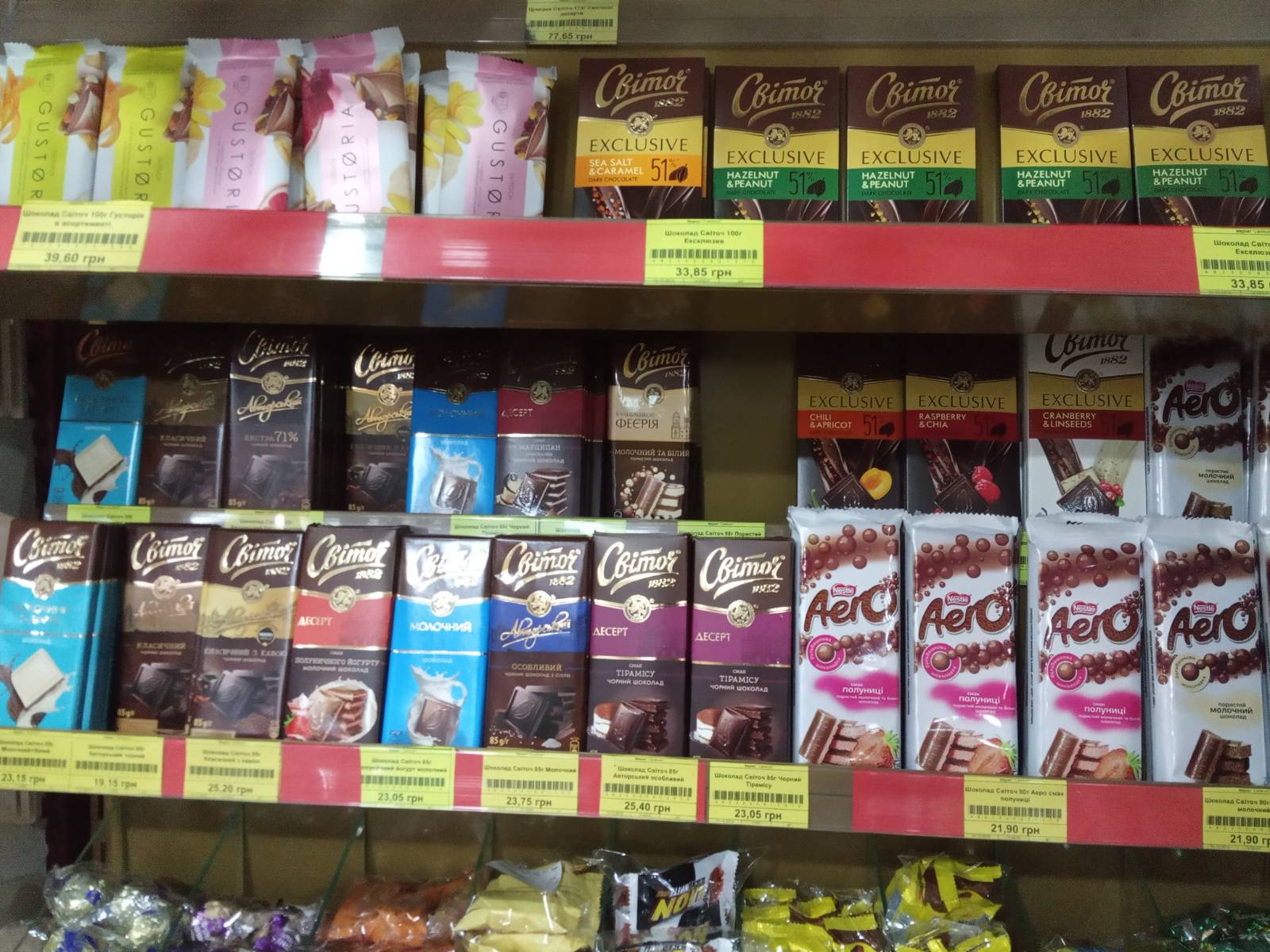 mitt1, Шоколад реально вкусный. Я бы хотел 6 плиток, обязательно молочный, 2 с вишней, 2 с черносливом, 2 с грушей. На такие вещи просто не обращаешь внимание, нам этот шоколад Гид посоветовала, когда были в отпуске в Карпатах. Там он на каждом шагу продается. В Львове он тоже был, покупал в большом торговом центре, если не ошибаюсь магазин "Сельпо"