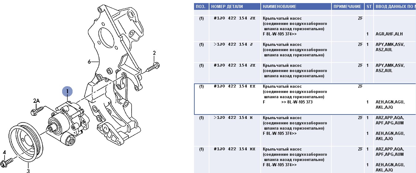 Для WAUZZZ8LZVA110781 идёт насос ГУР 1J0 422 154H или если сдать свой старый б/у насос официалам, то они вам дадут восстановленный на заводе 1J0 422 154HX.